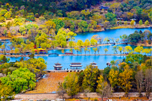 早餐后,游览【避暑山庄及周围寺庙】,这座规模宏大的园林始建于1703年,拥有殿、堂、楼、馆、亭、榭、阁、轩、斋、寺等建筑100余处,其最大特色是山中有园,园中有山。游客不仅可参观山庄美景,还可游览周围普宁寺、安远庙、广缘寺等庙宇(约4小时)。午餐在承德市区。